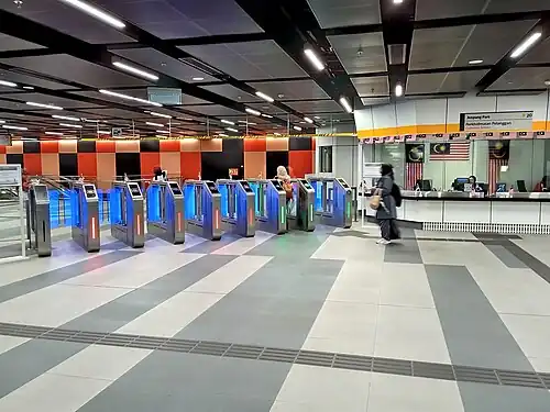 Paid-to-paid interchange between the Kelana Jaya Line and the Putrajaya Line, both underground, was planned for Ampang Park station; the integration was scrapped in favour of an out-of-station interchange due to cost-cutting measures.[2] Passengers will have to tap out from one line, resurface to ground level, and enter the other underground station when changing between the two lines with a 7 minutes walking time between platforms.
