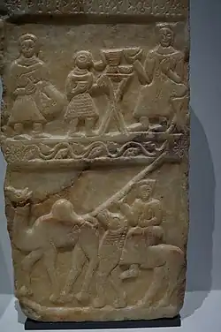 Funerary stele, in the upper band: banquet scene with three people, in the lower band: camel driver with two camels; 1st-3rd centuries AD; alabaster; height: 55 cm (2112 in.); Louvre-Lens (Lens, France)