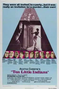 And Then There Were None (U.S. title: Ten Little Indians; also known as E Poi Non Rimase Nessuno, Ein Unbekannter rechnet ab, Diez negritos, Dix petits nègres[1]) is a 1974 mystery film and an adaptation of Agatha Christie's best-selling 1939 mystery novel of the same name.[2] The film was directed by Peter Collinson and produced by Harry Alan Towers.[1][2] This was the second of three versions of Christie's novel to be adapted to the screen by producer Harry Alan Towers. Two film adaptations were previously released (a 1945 version by René Clair and the 1965 adaptation Ten Little Indians). An American made-for-television version was broadcast in 1959.[3] Towers produced a third version in 1989.