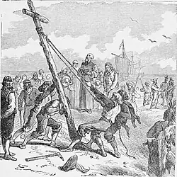 After a four month voyage, the three ships arrived at the Jamestown Colony to resupply. They then moved north up Chesapeake Bay. They landed on March 25, 1634, on St. Clement's Island off the north shore of the Potomac River. That day, White erected a large cross and celebrated a mass of thanksgiving. He became the first priest to celebrate a mass in the original thirteen English colonies.[6][4]