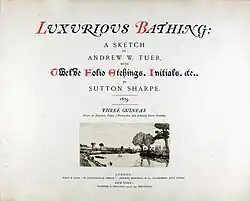 In 1879, the first official book of its new imprint, the Leadenhall Press, appeared: Tuer’s own Luxurious Bathing, a treatise on the joys of hygiene, with etchings by Sutton Sharpe.[1] From this point on, Scribner was the firm's U.S. import partner. The second edition was issued the following year in a smaller format with etchings by Tristram Ellis. Tuer's passion for collecting soon led to the two-volume Bartolozzi and his Works, with a biographical account, information on how to date impressions and identify deceptions, and a list of over 2,000 engravings. In 1884, Tuer published a collection of printers' jokes from the pages of the Paper & Printing Trades Journal, titled Quads within Quads, consisting of a midget folio housed in a block of extra pages at the back of a duodecimo "enlarged edition." The prospectus described it as "A book and a box, or rather two books and a box, and yet after all not a box at all, but a book and only one book."