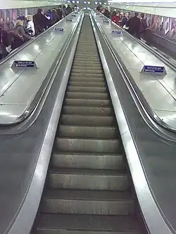 Angel is one of fourteen stations to have only escalator access to the platforms.[17] With a vertical rise of 90 ft (27 m) and a length of 200 ft (61 m), the escalators at Angel station are the longest on the Underground,[12][13] and in the United Kingdom.[18]