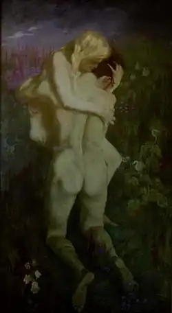 One of Costenoble's etchings, "Tod und Leben Oder Erde und Hummel (Perception of Life and Death or Sky and Earth), served as the inspiration for a number of poems written by Polish novelist and dramatist Stanisław Przybyszewski, who was not only a fan of hers but also lover to Costenoble.[5] Przybyszewski's poem utilized symbolic language to describe a sexual act between lightning (the sky) and a woman (earth), mirroring what is depicted in Costenoble's work. It describes how orgasmic intoxication unites death and life as mutually exclusive.[5] Costenoble was well acquainted with both Stanisław Przybyszewski and his spouse Dagny Juel-Przybyszewska. Costenoble painted and etched several portraits of the pair both separately and as a couple during their relationship.[6][7][8]