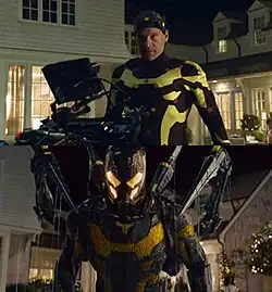 In June 2015, Feige confirmed that the character of Janet van Dyne would be seen, though the film would not address Pym and Van Dyne's infamous domestic abuse storyline in the comics, saying, "We hint at a temper in a way that people who know the stories might go, 'Oh, perhaps that's a bit of [Hank's] character,' but not in a way that would ever indicate [he beat his wife]."[167] Also in the month, Reed confirmed there would be a post-credit sequence "that may tie into the other films."[168] Feige revealed the post-credit sequence was footage shot by Anthony and Joe Russo for Civil War, saying the clip would be seen in that film, though it may be "different takes...different angles."[169][170] On June 25, 2015, Reed announced on social media that production of Ant-Man was officially complete.[171] In early July 2015, an international teaser trailer revealed that Anthony Mackie would appear in the film as Sam Wilson / Falcon.[39] Mackie appears in the post-credit sequence as well, along with Chris Evans and Sebastian Stan as Steve Rogers / Captain America and Bucky Barnes / Winter Soldier, respectively.[60] Stan stated the scene that was used for the post-credit sequence was shot in May 2015, and would appear in the middle of Civil War.[172] Reed also said that the end of the film originally had a sequence where Ant-Man went after Carson to retrieve the stolen vial of Cross' particles, "... But then for a couple reasons, it felt like maybe we should leave those particles out there."[173] For the title sequences, Marvel again went with design firm Sarofsky, who had done the credits for both The Winter Soldier and Guardians of the Galaxy (2014), with the credits "intricately connected to the film's overall narrative."[174]