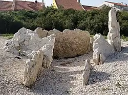 The dolmen is believed to have been made up of a polygonal chamber measuring 3.7 × 3.8 meters and formed by seven vertical stones (orthostats), together with an access corridor. Three large blocks have also been identified that may be fragments of the stone that covered the tomb. A few archaeological fragments were found at the site and they are now deposited in Lisbon's Geological Museum but many more were believed to have been taken prior to Ribeiro's excavations. The artifacts collected, as well as more recent radiocarbon dating, suggest that the chamber was used in the Late Neolithic period between the middle and end of the 4th millennium BC. Later, in the second half of the 3rd millennium or in the second millennium, additional funerary deposits may have been made in the access corridor.[1][2][3]