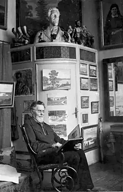 He also created posters and book illustrations.[4] His works are kept by various museums, including the Lithuanian National Museum of Art, Institute of Lithuanian Literature and Folklore, Vytautas the Great War Museum, Tretyakov Gallery in Moscow,[13] and Moscow State University.[4] catalogs of his exhibitions were published in 1956, 1957, and 1963. Albums of his artwork were published in 1966 and 1977 (paintings) as well as in 1987 (bookplates).[4] His paintings are regularly sold at art auctions. His most expensive painting Dzūkų kaimelis (Village of Dzūkai) was sold for 53,000 euros at Vilnius Auction in 2013.[18] It is a well-known painting that is frequently added to various albums of Lithuanian art and was originally acquired by Pranas Mašiotas in 1910.[19]
