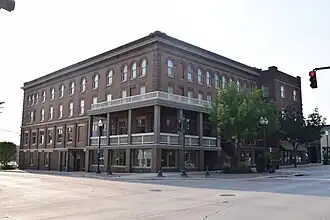 The Antlers Hotel is located in downtown Spirit Lake, Iowa, United States. From the 1880s to the early 1920s an alliance of railroad companies, entrepreneurs, and sportsmen made Spirit Lake and the Iowa Great Lakes region into an upscale tourist destination based on boating, hunting and gun tournaments. Completed in 1902, this hotel was built at the height of that development.[2] A significant addition to the hotel was completed in 1930. Starting in the 1920s tourism started to change with the increasing usage of the automobile compared to the railroads. This is one of the few railroad-era tourism related buildings remaining in the area. It was designed in the Neoclassical style by Austin, Minnesota architect Frank W. Kinney. The three-story brick structure is built on a raised basement. It features brick columns, arched windows, ornamental cornices and a wrap-around veranda. Antlers Hotel was listed on the National Register of Historic Places in 2007.[1] It has been renovated into a 14-unit apartment complex.