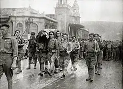 Following recovery in November Oriol was seconded to the alferéz provisional course in Burgos;[38] already as provisional lieutenant he joined the 2nd Company, deployed to unblock encircled Villarreal de Álava, in December.[39] In the first half of 1937 the unit engaged in the Biscay campaign; shuttled to the central front it took part in the battle of Brunete in July.[40] In September, renamed to 8th Requeté Company of Álava, it was deployed in Cantabria; during later combat in Asturias Oriol was already commanding the 1st Section.[41] Following the Northern campaign the company took part in victory parade in Vitoria, to be shuttled to Teruel by the end of 1937. Oriol was wounded for the second time near Mata de los Olmos in March 1938;[42] treated in the hospital,[43] he re-joined his unit in June at the Castellón front.[44] He commanded the section during heavy fightings in Sierra de Pandols during the Battle of Ebro;[45] the campaign earned him an individual Military Medal.[46] In December 1938 the company was deployed in Huesca, to take part in the Catalonia offensive in early 1939.[47] In March promoted to capitán de infantería, Oriol finished the war commanding his unit near Cartagena.[48]