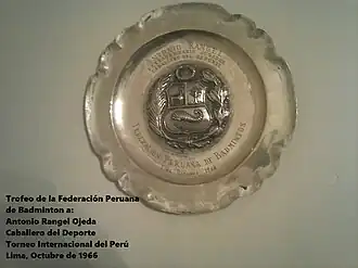 When the competition was finished, Antonio Rangel prolonged his stay in Peru, accepting an invitation from the Peruvian Federation of Badminton, who wanted to promote further the badminton in Peru by organising some exhibition games in the Naval Centre of Peru (el Centro Naval del Perú), the Pacific Expo (la Feria del Pacífico) and some sporting precincts such as the "Club Regatas" of Lima and the "Club Lawn Tennis de la Exposición".[6] For his involvement, the then Mayor of Lima, Dr Luis Bedoya Reyes, gave Antonio Rangel a plate for his first place in the 1st International Tournament of Peru with an inscription: "Ambassador of Badminton". Also, the Naval Centre of Peru gave him an award for his collaboration in fomenting the badminton among the youth in Peru. Finally, the President of the Peruvian Federation of Badminton, Don Alfredo Salazar, expressed their gratitude to Antonio Rangel with the following words:[6]