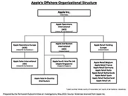 In May 2013, Apple's tax practices were examined by a US bipartisan investigation of the Senate Permanent Subcommittee on Investigation.[36] The investigation aimed to examine whether Apple used offshore structures, in conjunction with arrangements, to shift profits from the US to Ireland.[37] Senators Carl Levin and John McCain drew light on what they referred to as a special tax arrangement between Apple and Ireland which allowed Apple to pay a corporate tax rate of less than 2%.[38][39][40][41]