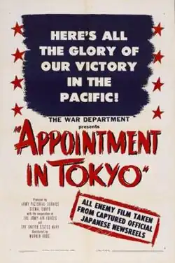 Appointment in Tokyo is a 1945 documentary produced by the Army Pictorial Service, Signal Corps, with the cooperation of the Army Air Forces and the United States Navy, and released by Warner Bros. for the War Activities Committee shortly after the surrender of Japan. It mainly follows General Douglas MacArthur and his men from their exile from the Philippines in early 1942, through the signing of the instrument of surrender on USS Missouri on September 1, 1945.[1]