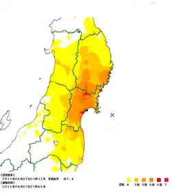 The Mw7.1 submarine earthquake occurred at a focal depth of 49 km (30.4 mi) in the western Pacific Ocean on 7 April 2011 at 14:21 UTC, approximately 66 km (41 mi) east of Sendai. The quake was a direct result of thrust faulting on or near the subduction zone plate boundary between the Pacific and North American plates. Initially estimated at a magnitude of 7.4, the tremor was felt in several areas near the east coast of Honshu as an aftershock of the 11 March magnitude 9.0 megathrust Tōhoku earthquake. The aftershock sequence of this event is ongoing since 11 March, and includes over 58 earthquakes of magnitude 6.0 or greater up until 7 April 2011, with only two others of magnitude 7.0 or greater.[1]