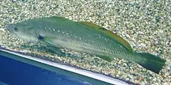 Argyrosomus japonicus is a large, slender fish which can grow to 2 m (6 ft 7 in). It has a copper-colored head and is silvery with a bronze-green dorsal surface and paler belly. It has a row of distinctive white spots running along the lateral line. The caudal fin is angular in juveniles but becomes more rounded in larger fish.[3]