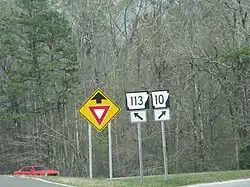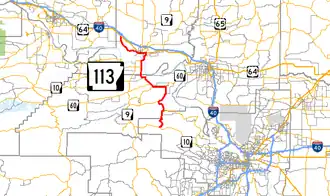 Highway 113 begins at Highway 10 south of Wye.[2] It runs north 5.8 miles (9.3 km) to Wye where Highway 300 forms a concurrency. The route then continues heading north for 3.2 miles (5.1 km) to Pleasant Valley where Highway 300 continues west. Highway 113 continues heading north and heads through Bigelow and then joins with Highway 60 west to Houston.[3]