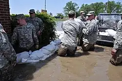 Arkansas National Guardsmen helping fight flood waters in the small community of Payneway, May 2011