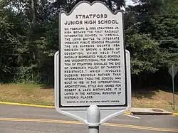 On January 19, 1959, the Supreme Court of Virginia effectively ended massive resistance by ruling in James v. Almond that public school closures in violated of the Constitution of Virginia.[9][10][11] On January 22, the Arlington County School Board announced that Stratford Junior High would be the first school to be desegregated. On February 2, four black students- Ronald Deskins, Michael Jones, Gloria Thompson and Lance Newman- arrived at Stratford, protected by nearly 100 police officers, hoping to avoid what had happened to the Little Rock Nine. The desegregation of Stratford, the first public school in Virginia to be desegregated, ultimately passed without incident, and an Anti-Defamation League newsletter declared it "The Day Nothing Happened".[12][5][13] With this, Arlington County became the first school system in Virginia to desegregate.[14][15]
