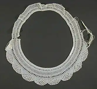 Tablecloths, curtains, blankets, ribbons of various bochchas, handkerchiefs, headscarves, as well as collars and various household items (comb bowls, button, handkerchief pockets, etc.) were made using lace weaving. The "rose" on the forehead, which was a part of head decorations of the Upper Armenia women's costume, is worthy of attention. It was woven with a needle, multi-colored silk threads, combined patterns of small flowers and leaves. The white, silk lace suspenders with lily patterns of the Cilicia-Armenian women's costume are of interest.[6] In Karin (Erzurum), Van, Baghesh, women wove the laces of their foreheads, the edges of yapush, and yazmans.[7] In the decoration of the head of the Armenian women's costume of Karin, not only silk threads were used, but also mother-of-pearl laces, which were sometimes woven with gold threads. Ribbon-shaped mesh pearl braided laces were hung on the temples and used as necklaces. Lace tablecloths and curtains were popular in Shatakh.