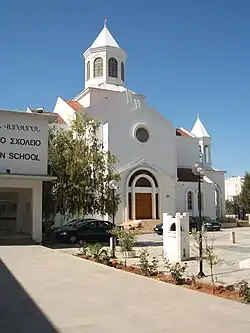 The Virgin Mary cathedral was built between 1976 and 1981 by architects Iacovos & Andreas Philippou, with financial help from the World Council of Churches, the Evangelical Church of Westphalia, the Republic of Cyprus, the Holy Archbishopric of Cyprus and the faithful. Located next to Nareg Elementary School, its foundation stone was laid on 25 September 1976 by Archbishop Makarios III and Bishop Nerses Pakhdigian. On 16 April 1978, the Co-adjutor Catholicos Karekin II blessed the 16 columns of the church, while the inauguration and consecration of the cathedral took place on 22 November 1981 by Catholicos Khoren I and his Co-adjutor Karekin II. It is the only church in Cyprus built in a traditional Armenian style, with a central octagonal dome and a smaller dome for the bell. The church was renovated externally in late 2005 in memory of the Tutundjian family, killed in the Helios air accident, while the belfry was also repaired that year, in memory of archpriest der Vazken Sandrouni.[2] Liturgies are held every Sunday. The church celebrates on the nearest Sunday to 21 November, feast day of the Presentation of Mary. The parish priest (as of 2000) is Fr. Momik Habeshian.