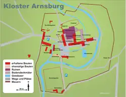 The abbey lies in a bend of the Wetter river, on low ground. A mill run is diverted upstream and flows through the abbey precinct. Today, the site is a mixture of various architectural styles from the late Romanesque to the Baroque. The state of preservation differs significantly.