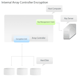 For an internal array controller configuration, the array controller is generally a PCI bus card situated inside the host computer. As shown in the diagram, the PCI array controller would contain an encryption unit where plaintext data is encrypted into ciphertext. This separate encryption unit is utilized to prevent and minimize performance reduction and maintain data throughput. Furthermore, the Key Management Client will generally be an additional service within the host computer applications where it will authenticate all keys retrieved from the Key Server. A major disadvantage to this type of implementation would be that encryption components are required to be integrated within each host computer and therefore is redundant on large networks with many host devices.