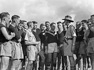 Blackburn stopped practising law in 1940,[1] and on 20 June was appointed to raise and command the 2/3rd Machine Gun Battalion, part of the Second Australian Imperial Force raised for service overseas during World War II.[59] He was one of only three Australian World War I VC recipients to volunteer for overseas service in World War II.[84] Eleven of the officers selected by Blackburn for his new unit were former officers of the 18th Light Horse (Machine Gun) Regiment, including the battalion second-in-command, Major Sid Reed, who was to prove valuable in moderating Blackburn's temper at times. The unit was raised in four different states; headquarters and A Company in South Australia, B Company in Victoria, C Company in Tasmania and D Company in Western Australia.[85] It concentrated in Adelaide on 31 October, after which Blackburn moulded the separately raised companies into one organisation. Multi-day route marches featured strongly in their training; Blackburn invariably marched at the front of his battalion.[86] After undergoing training, the battalion entrained for Sydney where it embarked on SS Ile de France on 10 April 1941. The battalion sailed for the Middle East via Colombo, where they had ten days' leave, and disembarked in Egypt on 14 May.[59][87] Upon arrival, the battalion was assigned to the 7th Division in Palestine, where it underwent further training[88] at a camp just north of Gaza.[89]