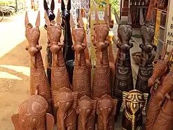 Wooden art is a very old tradition of West Bengal. Wooden protima or idol is seen in Indian Museum. The art-making wooden dolls have been an age-old practice in West Bengal and Natungram is one of them. Natungram, a village of West Bengal makes wooden dolls like Gouranga, Krishna, Bor-Bou, Gour-Nitai, owl etc.[41] Gomira masks of North and South Dinajpur in West Bengal are also made of wood.[42][43]