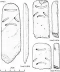 Several petroglyphs with designs similar to those of Deer stones, such as individuals with weapons, horse charriots, deers or shields were discovered at the eastern side of the kurgan.[26]