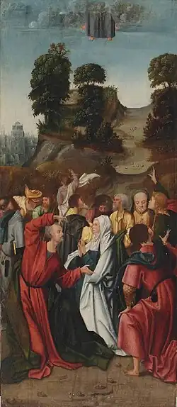 John's Gospel has three references to ascension in Jesus' own words: "No one has ascended into heaven but he who descended from heaven, the Son of Man" (John 3:13); "What if you [the disciples] were to see the Son of Man ascending where he was before?" (John 6:62); and to Mary Magdalene after his resurrection, "Do not hold me, for I have not yet ascended to my Father..." (John 20:17).[7] In the first and second Jesus is claiming to be the apocalyptic "one like a Son of Man" of Daniel 7;[21] the last has mystified commentators – why should Mary be prohibited from touching the risen but not yet ascended Christ, while Thomas is later invited to do so?[22]