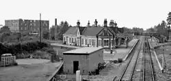 At this time, Ashchurch station was then renamed to Ashchurch for Tewkesbury, only for it to be also closed in 1971 having been unstaffed since 14 September 1970.[9] The once sizeable goods yard here had previously closed on 1 June 1964, though MOD traffic continued to be handled. The buildings were demolished in June 1972; the main line platforms and footbridge were removed early in 1974. There used to be a connecting curve linking the two branches; it crossed the main line on the level just north of the station and created a layout which may have been unique in Britain, but this curve closed in December 1957. There was an extensive goods yard to the south and a large grain store to the north west.[10]