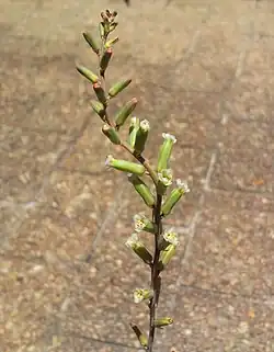 This species produces cream-white flowers in the rainy season (July to March depending on region), tinged with green or yellow. Like its eastern relative Astroloba congesta its flowers have unusually short pedicels. However Astroloba congesta has wider stems and concave upper faces to its leaves. Its close relative to the west, Astroloba robusta, has no pedicels at all and longer grey-brown leaves.[1][2]