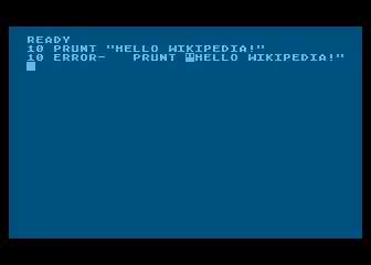 Atari BASIC's editor catches many errors are ignored in Microsoft-derived versions. If an error is found, the editor re-displays the line, highlighting the text near the error in inverse video. Errors are displayed as numeric codes, with the descriptions printed in the manual.[23] Because of the way the line editor works, the user can immediately fix the error. In the example pictured above (with PRUNT), the error can be fixed by moving the cursor over the U, typing I (the editor only has an overwrite mode), and hitting RETURN.