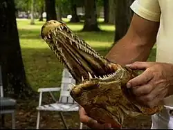 On September 4, 2009, a 3 ft 3 in (0.99 m) alligator gar was found in Tak Wah Park in Tsuen Wan, Hong Kong. Over the next two days, at least 16 other alligator gar, the largest measuring 4.9 ft (1.5 m), were found in ponds within public parks in Hong Kong.[34] Nearby residents reported the alligator gar had been released into the ponds by aquarium hobbyists, and had lived there for several years. However, after a complaint made by a citizen who falsely identified alligator gar as crocodiles, the use of terms like "horrible man-eating fish" had begun appearing in the headlines of some major local newspapers. Officials with Leisure and Cultural Services in Tak Wah Park removed all the alligator gar from the ponds because they were concerned the large, carnivorous fish might harm children.[35] Not unusually, the large, sharp teeth and outward appearance of alligator gar can precipitate unreasonable fear in those unfamiliar with the species. Sensationalized reports have contributed to the misconception of predatory attacks by alligator gar on humans, though none of the reports have been confirmed.