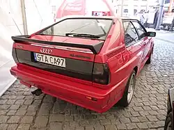 The Audi Quattro is a road and rally car, produced by the German automobile manufacturer Audi, part of the Volkswagen Group. It was first shown at the 1980 Geneva Motor Show on 3 March.[1][3] Production continued through 1991.