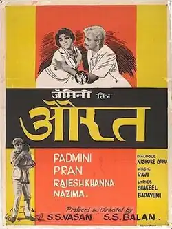 Aurat (lit.'Woman') is a 1967 Indian Hindi-language film produced and directed by S. S. Balan and S. S. Vasan. It is a remake of the 1966 Tamil film Chitthi. It stars Padmini, Feroz Khan, Rajesh Khanna, Pran, Nazima, O. P. Ralhan in pivotal roles, along with Kanhaiyalal, David, Lalita Pawar, Leela Chitnis in supporting roles. The film's music is by Ravi. The film is totally revolving around the character of Parvati's life. The film deals with how Parvati (played by Padmini), who is in true love with Anand (Feroz Khan), is forced by circumstances to marry Manoharlal (Pran) against wishes of her brother Suresh (Rajesh Khanna) and later is tested by life to show whether after marriage to Manoharlal, she is truly affectionate to Manoharlal.