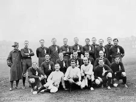 5. ^ A photograph of the mounted set that was sent to the Collingwood Football Club appears at Ross, (1996), p.89; Ross lists the source of the photograph as the Collingwood Football Club on p.370 (which is consistent with the mounted set being prepared, in part, for donation to each player's club). An almost identical pair of photographs, taken by the same photographer, at the same time (the fourth and the third players from the right in the back row also have their hands on the shoulders of the player seated at the right of the middle row), of the same men, are held by the Australian War Memorial (see [1] Archived 28 September 2011 at the Wayback Machine and [2] Archived 28 September 2011 at the Wayback Machine). Note that, on the evidence of the date on the mounting board (Ross, p.89), and the Times newspaper reports of 27 and 30 October 1916, and that in the text of Holmesby & Main, (1996, p.49), who had access to the news film — all of which place the match on Saturday 28 October 1916 — the date currently (viz., at 25 April 2008) given by the Australian War Memorial for the match (i.e., 2 November 1916) is mistaken.