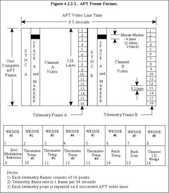 The broadcast transmission is composed of two image channels, telemetry information, and synchronization data, with the image channels typically referred to as Video A and Video B. All this data is transmitted as a horizontal scan line. A complete line is 2080 pixels long, with each image using 909 pixels and the remainder going to the telemetry and synchronization. Lines are transmitted at 2 per second, which equates to a 4160 words per second, or 4160 baud.