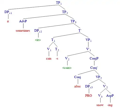Figure 3. Syntax phrase structure tree using Chomsky's example sentence. This English sentence reads, "It sometimes rains after snowing." N.B. The angled brackets around green-coloured "it" and "rain" indicate syntactic movement. The tree was creating using phpSyntaxTree.[6]