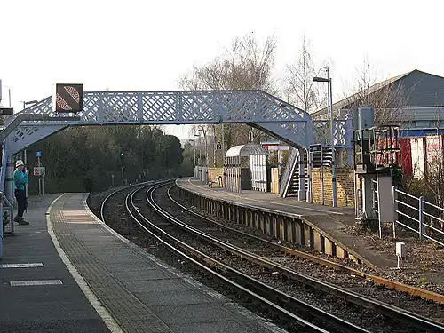 Aylesford railway station serves the village of Aylesford, in Kent, England. It is a stop on the Medway Valley Line, 38 miles 74 chains (62.6 km) down the line from London Charing Cross, via Strood; it is situated between New Hythe and Maidstone Barracks. The station is operated by Southeastern, along with all trains that serve it.