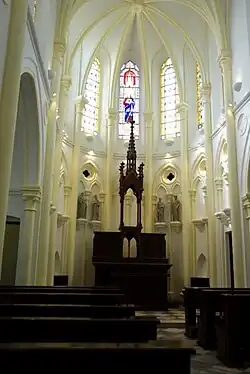 Based on neo-Gothic design, Béthanie is a composition of symmetrical cylinders. Apart from that, ogive, tracery, stained glass and Gothic arched windows can be found in the building. With a high ceiling and pitched roof, the George C. Tso Memorial Chapel is a typical illustration of neo-Gothic architectures in Béthanie, though in a much simpler style and smaller scale. Among its nineteen stained glass windows, nine were originals. The remaining ones, either in disrepair or missing, were reproduced hand-made in the Philippines. Also, only four out of the twelve statues of the apostles, originally standing on corbels above the altar, have been found. Although the genuine ones were unavailable for exhibition, the Academy has replicated the statues with a silicone molding technique. Moreover, many neo-gothic structures within the perimeter have been conserved. One of these examples are the flying buttresses that were used to support the exteriors of buildings in the past. Although no longer functional, they have been restored to maintain authenticity. The Rib vaults, built in to support the ceiling and roof have also been retained in the chapel for decorative purposes.