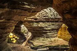 There is a several-hundred-metre-long tourist route running between various rock formations such as rock maces, mushrooms, or pillars.[1] Some of the rocks have their own names such as Stołowy Głaz, Tunel, Kuchnia or Kurza Stopka.[1] In the narrowest places, tourists have to squeeze through rocky crevices several dozen centimetres narrow.[1]