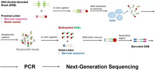 Similar to BLESS, DSBCapture uses biotinylated adapters to label DSBs in situ and streptavidin beads to isolate labeled DNA fragments for amplification and sequencing.[9] While labeling in BLESS relies on blunt-end ligation, DSBCapture uses more efficient cohesive-end ligation to attach biotinylated modified Illumina adapters. In addition, DSBCapture relies on fewer PCR steps compared to BLESS, reducing amplification bias.[10] This method also generates libraries with higher sequence diversity than BLESS, eliminating the need to spike in other libraries to improve diversity prior to sequencing. Furthermore, DSBCapture uses single-end sequencing in contrast to BLESS where sequencing can begin from both ends. Single-end sequencing results reflect only the sequences of DSB sites, improving data yield.[11]