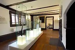 The historical Bach House is one of the oldest residential buildings in Eisenach. It originally consisted of two buildings, of which the eastern part was built in 1456 and the western part in 1458. At around 1611, both were joined.[10] As was normal with the Ackerbürgerhäuser (burghers' houses) of that time, the ground floor was used for agricultural purposes: today's instrument hall may have been used as a barn, and the rooms next to the stairs for cattle and horses.[11] In the museum, a cowbell from 1688 found in the Bach House garden reminds of this past. In the first floor of the building, a Renaissance glass window frame and the timber panelling of the living room now decorated as Composing Studio still bear witness of the citizen status of the house's former occupants. At the time of Bach's birth it was owned by Heinrich Börstelmann, headmaster of the Latin School. In 1746, the family of Caroline Amalie Rausch née Bach moved into the building and lived there until 1779. Caroline Amalie was the daughter of Bach's second cousin and friend Johann Bernhard Bach and sister to Johann Ernst Bach, a student of Bach at Leipzig and then court music director at Eisenach.[12]