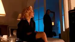 Screenshot of the "Bad Girl" music video, depicting Louise Oriole (Madonna) after her guardian angel (Christopher Walken) has given her what Georges-Claude Guilbert considered to be a "kiss of death"[64]