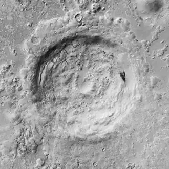 Badwater Crater is an impact crater located in Hellas Planitia and is situated within the low lying Plain of Peneus Palus on the southern hemisphere of Mars. It contains the lowest currently known point on the entire planet, with an elevation of approximately −8,200 metres (−26,900 ft)[2] at 32.79° S, 62.14° E.[1] Badwater has a diameter of approximately 33.14 kilometres (20.59 mi).[1]