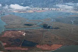 Bair Island is the largest undeveloped island in the San Francisco Bay and was used for farming, grazing and salt production since the 19th century.[8] A residential development called South Shores had been proposed to build a housing estate with 4000 houses on the marshland. It was approved by the Redwood City council, but a citizens referendum narrowly defeated the project in 1982 by just 44 votes.[9][8] The Peninsula Open Space Trust purchased the property in 1996 and deeded the site to be part of the Don Edwards National Wildlife Refuge,[10] and the Bair Island Ecological Reserve was established in 1997.[5] In 2013, a pedestrian bridge was opened to connect to trails around the island to allow access to the naturally restored wetlands.[11] In 2017, tour guides began leading pedestrians on the trails and showing the effects of wetland restoration.[12] Some species that have flourished since the restoration are the California Ridgway's rail, pickleweed, and pelicans.[13]