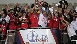 Balzan players celebrating the club's first major title in 2019, after defeating Valletta 5–4 on penalties in the Maltese FA Trophy final.