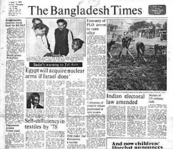 The Bangladesh Times was founded in 1974 by Sheikh Fazlul Haque Mani.[7] In 1975, The Bangladesh Times along with Ittefaq, Dainik Bangla, and Bangladesh Observer were nationalized by the Government of Bangladesh. The government banned all newspapers except the four nationalized ones.[8] Following the assassination of Sheikh Mujibur Rahman in the 15 August 1975 Bangladesh coup d'état the newspaper welcomed the government of Khandaker Moshtaque Ahmed.[9] Enayetullah Khan, the editor of the Holiday, became editor of the newspaper in 1975. Khan would write against Sheikh Mujibur Rahman in the newspaper and would go on to serve as a Minister in the Ziaur Rahman administration.[10] In May 1976, The Bangladesh Times provided the biggest media coverage in Bangladesh to the Farakka Long March.[11] Khan served as the editor of the newspaper till 1977.[12] The Bangladesh Times were closed in 1997 along with Danik Bangla and other state owned newspapers.[13] In March 2004, Information Minister Tariqul Islam said the government is considering reopening the newspaper along with Dainik Bangla under private management.[14]