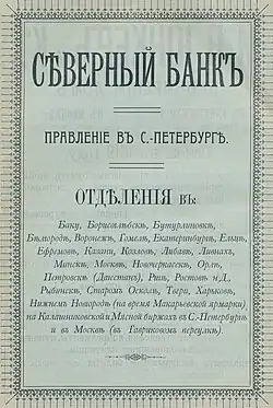 By 1907, in addition to the head office in Saint Petersburg it had branches in Baku, Belgorod, Borisoglebsk, Buturlinovka, Gomel, Kazan, Kharkiv, Kozlov (now Michurinsk), Liepāja, Livny, Minsk, Moscow, Nizhny Novgorod (during fair), Novocherkassk, Oryol, Petrovsk-Port (now Makhachkala), Riga, Rostov-on-Don, Rybinsk, Stary Oskol, Tver, Voronezh, Yefremov, Yekaterinburg, and Yelets.[3]