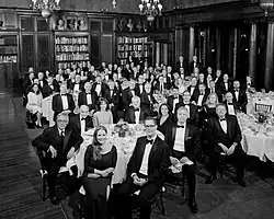 Some noted banquet photographers were Edward J Kelty (1888–1967) who was an early banquet camera user who photographed circuses predominantly with traditional banquet cameras. Eugene Omar Goldbeck (1892–1986) known as the "unofficial photographer of America's military,"[5] used Cirkut cameras which worked outside and rotated, whereas the traditional banquet camera with flashbulbs worked just as well inside.[6] Miles Weaver (1879–1932) ran one of the largest banquet and panoramic photography studios in Los Angeles. His work included early Academy Award celebrations, religious revivals, movie publicity stills and bathing beauty pageants.[7] George R. Lawrence (1869–1938) was renowned for developing a flash powder that permitted indoor banquet photography. His system required flash powder in many locations around a room, sometimes in as many as 350 spots. A single electric charge exploded all the powder, generating more light and less smoke than previous methods.[7] In New York city from 1923 to 1995 The Standard Flash Company[8] and later known as Standard Studios with principal photographers Kenneth Brooks (1926–1995) and Jayson Jons (1922–2012) (born John Selepec[9]) photographed thousands of banquet photos. In Chicago Thomas Yanul (1940–2014) did banquet photos for both corporate and social events.[10] Modern photographers that still use the original technology includes Terry Gruber, who uses a 100-year-old, 12×20-inch banquet camera for contemporary occasions.[11]