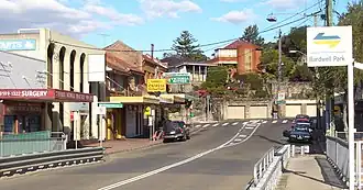 Bardwell Park was named after free settler Thomas Hill Bardwell who owned land in the area.[2] His grant was originally heavily timbered and bounded by Wolli Creek, Dowling Street and Wollongong Road. In 1881, the land was auctioned and 1,600 acres (6.5 km2) were subdivided. The railway station opened on 21 September 1931 which opened up the area for home sites. The school opened in September 1943 and the post office opened in May 1946.[3] Up until 2016 it was the only suburb in Sydney not to have traffic lights. However, due to many road incidents at the Slade Road and Hartill-Law Avenue intersection, which also proved to be a risk to pedestrians, and to community action which was also faced with ongoing delays from the then Rockdale Council,[4] traffic lights were eventually installed and turned on on 11 August 2016.[5]